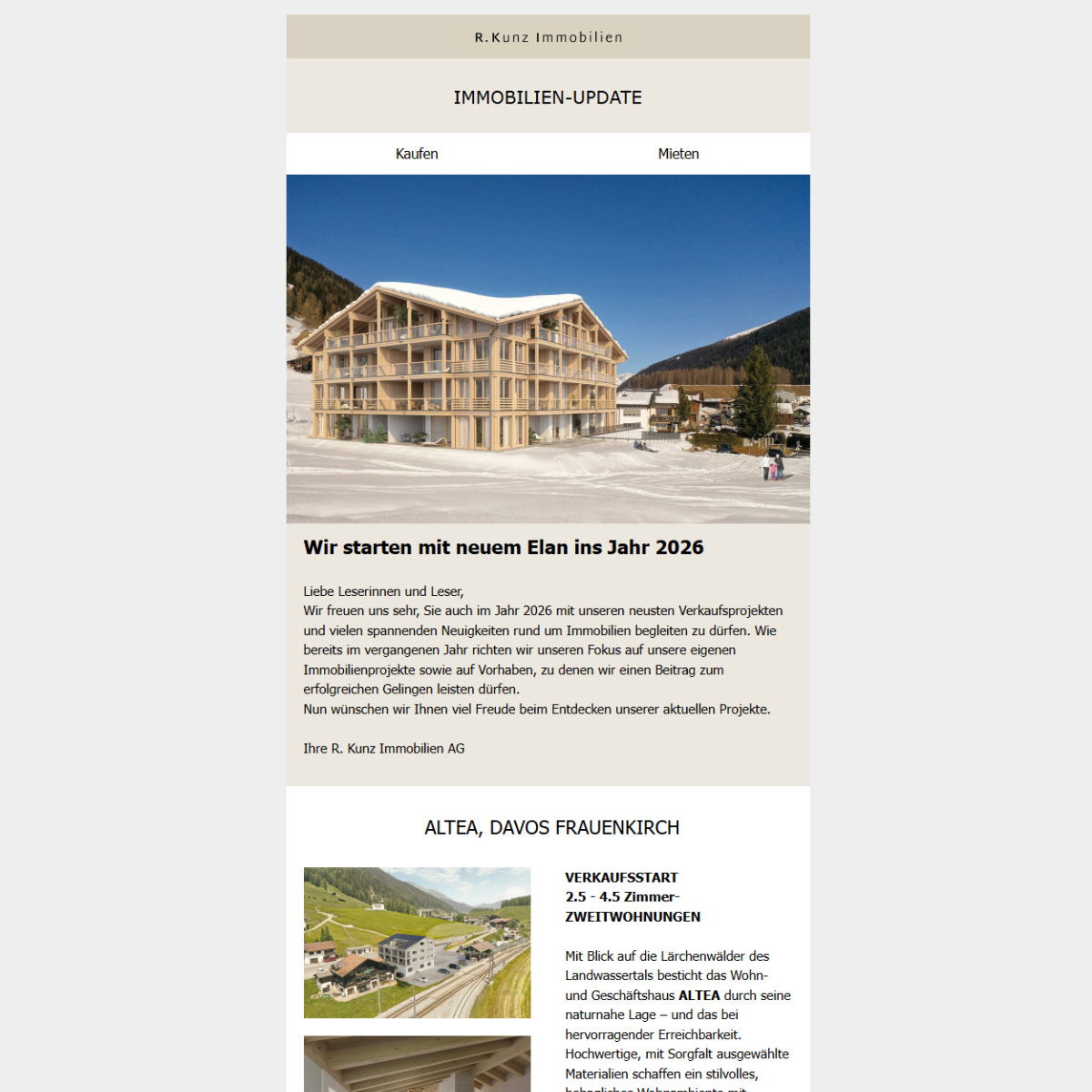 - Neubauprojekt ALTEA, Davos Frauenkirch: Das Wohn- und Geschäftshaus ALTEA verbindet naturnahes Wohnen mit hervorragender Erreichbarkeit und bietet hochwertige 2.5- bis 4.5-Zimmer-Zweitwohnungen mit alpinem Charme, lichtdurchfluteten Räumen und durchdachten Grundrissen.