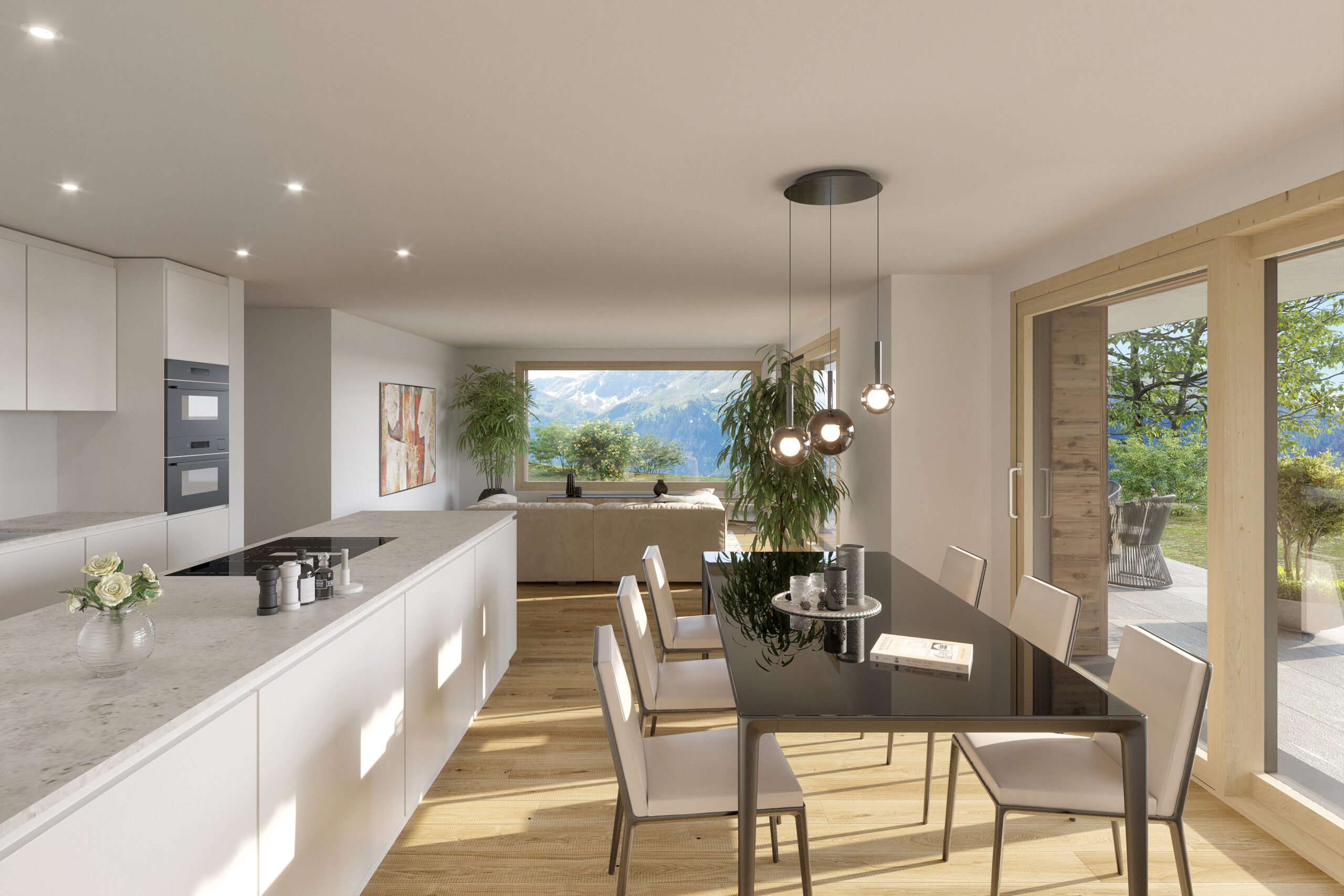 Das gesamte Projekt wird nach modernsten Standards und mit nachhaltiger Technik realisiert: Eine umweltfreundliche Grundwasserwärmepumpe und Solarpanels auf dem Dach sorgen für eine effiziente und nachhaltige Energieversorgung. Die Kombination aus durchdachter Architektur, hochwertiger Ausstattung und ökologisch verantwortungsbewusster Bauweise macht «Abelia» und «Begonie » zu einem zukunftsweisenden Wohnprojekt an einer der begehrtesten Lagen von Davos Dorf.