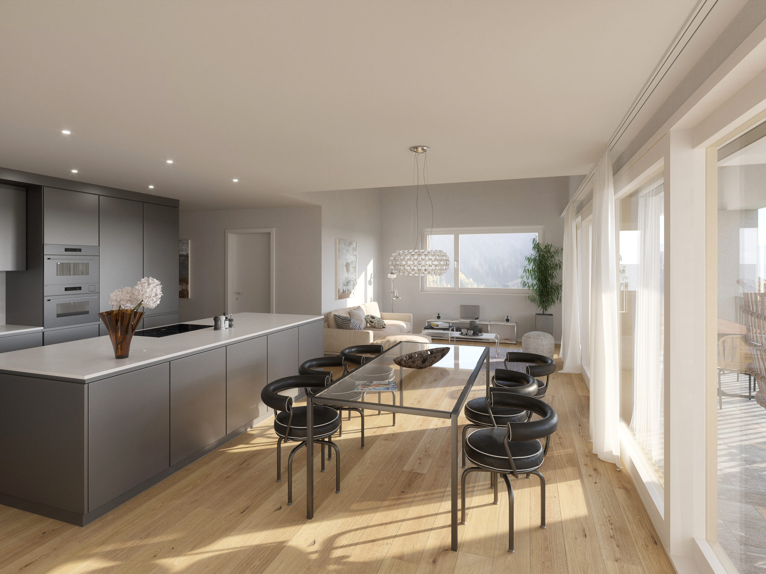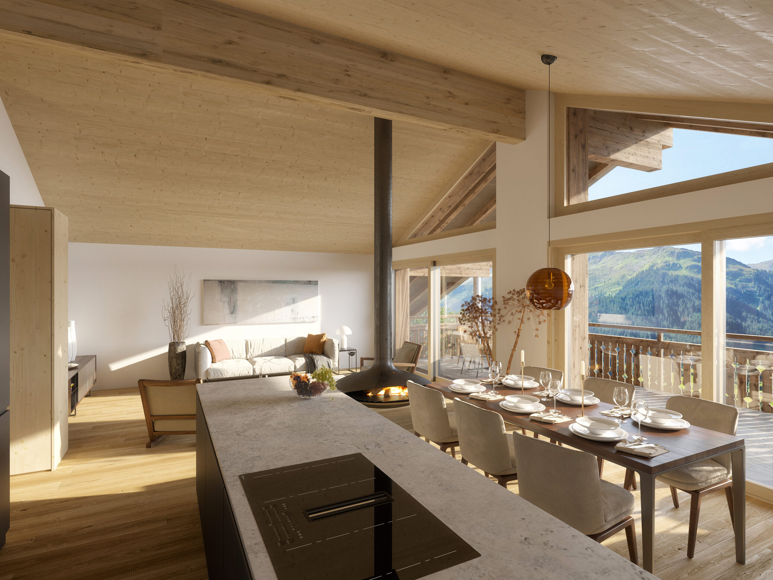 Das Neubauprojekt «Felina» umfasst insgesamt fünf exklusive Wohnungen, die durch ihre sorgfältig durchdachte Gestaltung beeindrucken. Die Architektur setzt neue Massstäbe und kombiniert moderne Eleganz mit traditioneller Bauweise, inspiriert von der Region Davos. Die grosszügigen, lichtdurchfluteten Räume mit grossen Fenstern schaffen eine harmonische Verbindung zwischen Innen- und Aussenbereichen, wobei die Südausrichtung für maximale Sonneneinstrahlung sorgt. Jede Wohnung vermittelt zugleich ein Gefühl von Geborgenheit und Freiheit– ideal für Menschen, die das Aussergewöhnliche suchen.